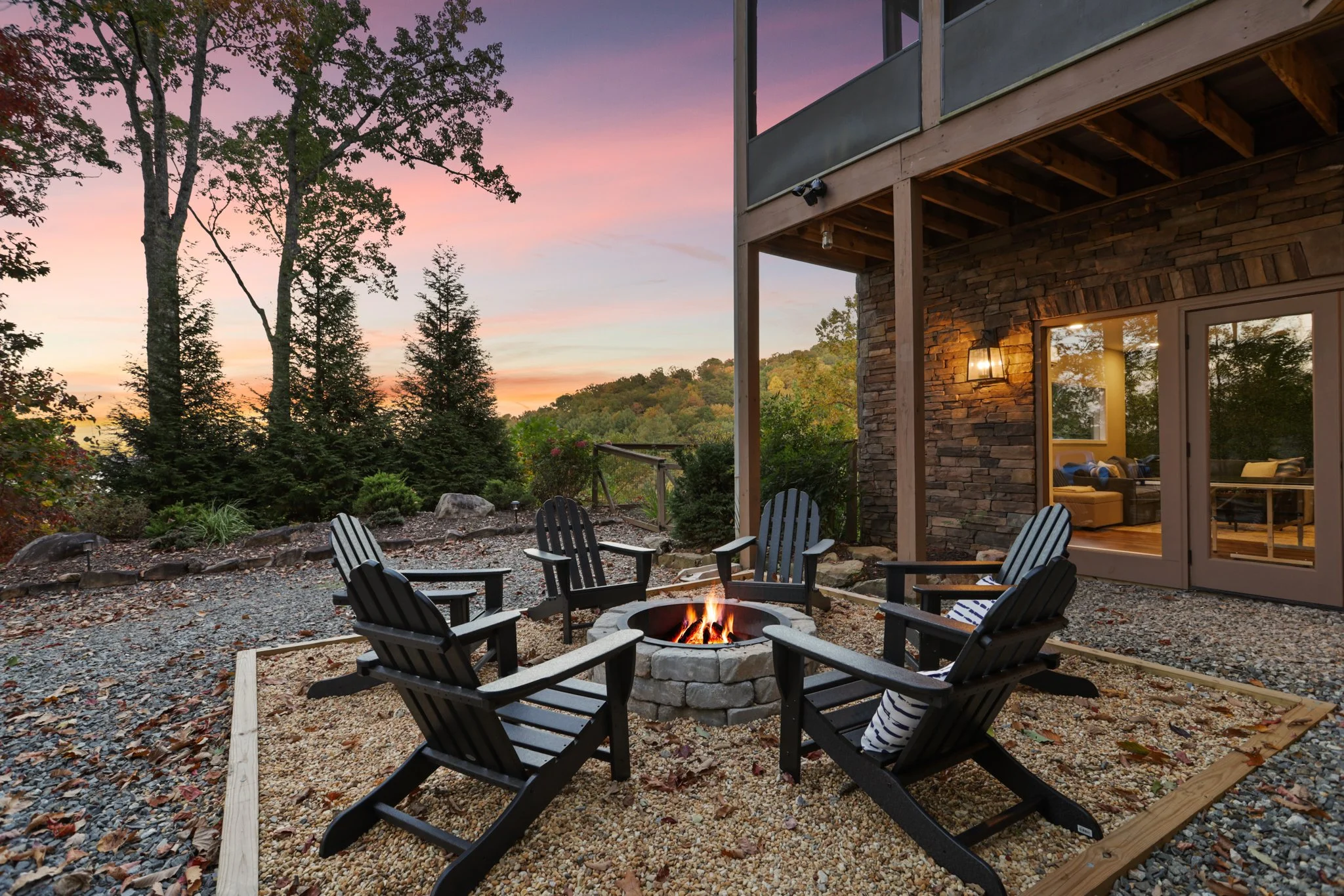 Open concept living and dining area that boasts a cozy gas fireplace and large windows that offer breathtaking views of Lake Blue Ridge and the mountains.